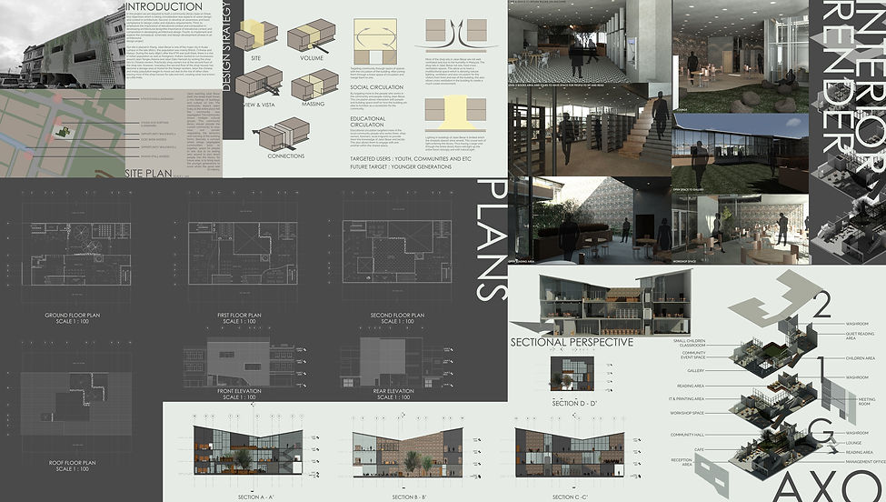 In this studio, we are required to take into consideration key aspects of urban design and context in relation to architecture, develop an awareness and basic compliance to Design Codes and Statutory Requirements, emphasize the importance of elevation context and composition in developing architectural design and implement and explore the conceptual, schematic and design development phases in an architectural design project. Our site is chosen at KLANG, Jalan Besar. The building site that we need to built a library is between Chong Kok kopitiam and also OCBC Bank. The library that we are required to built have to relate to the points above. In this project i have learned to demonstrate the fundamental knowledge of Design Codes and Regulations, explore plan-section and elevation studies to resolve relevant aesthetic, construction and environmental issues in the design development phase, produce a design outcome that encompasses the appropriate site-specific architectural responses through its formal, cultural, legislative, structural and environmental design solutions for specific urban issues, produce drawings (both 2D and 3D), models and presentations to verbally and visually communicate architectural ideas and scheme.